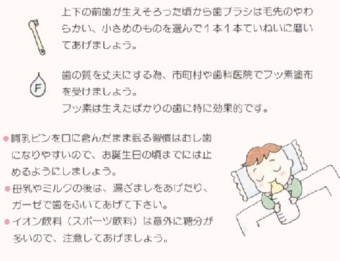 生後10カ月頃から上の前歯が生えてきますが、ここは唾液による洗浄作用が届きにくい場所なので、歯についた汚れが自然にはとれにくく歯ブラシによる歯磨きが必要になってきます。歯磨きの導入時期ですので,手早く磨いて歯ブラシに慣らし、1日1回の歯磨き習慣をつけましょう。また、寝る前の授乳はそろそろやめにして、ジュースやスポーツ飲料を哺乳ビンで与えることもむし歯の原因となりますので、1歳を目安に卒業しましょう。