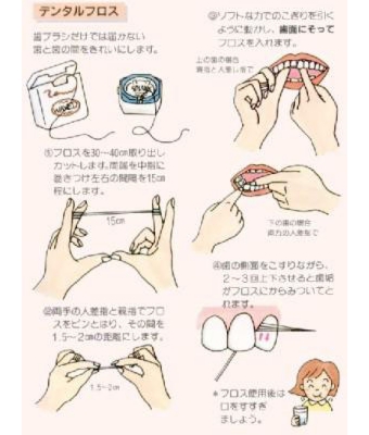 歯垢(プラーク)がつきやすい部分、どこが磨き残しやすいのか、よく確認して 磨き残しがないようにすることが大切です。歯と歯の間の汚れは、歯ブラシだけ では完全に取り除くことができないのでデンタルフロス(糸)や糸ようじを使い ます。