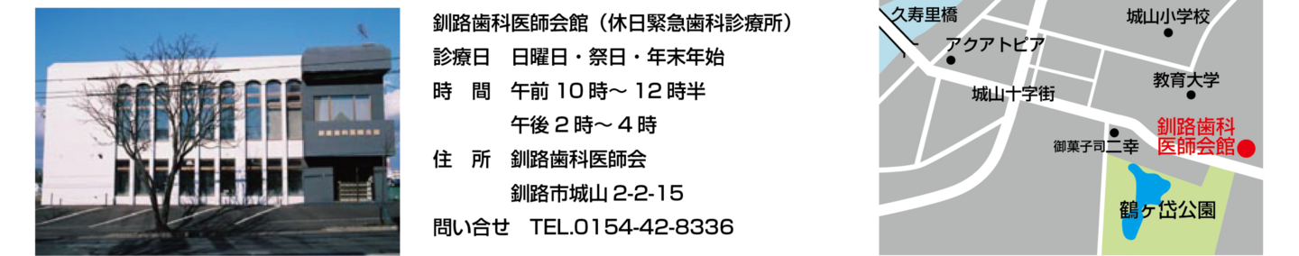 釧路市より委託を受けて釧路歯科医師会が運営をしており、会員が交代で診療に当たっています。かかりつけの歯科医院が休診の際の応急処置のみのため継続した治療は行っておりません。
